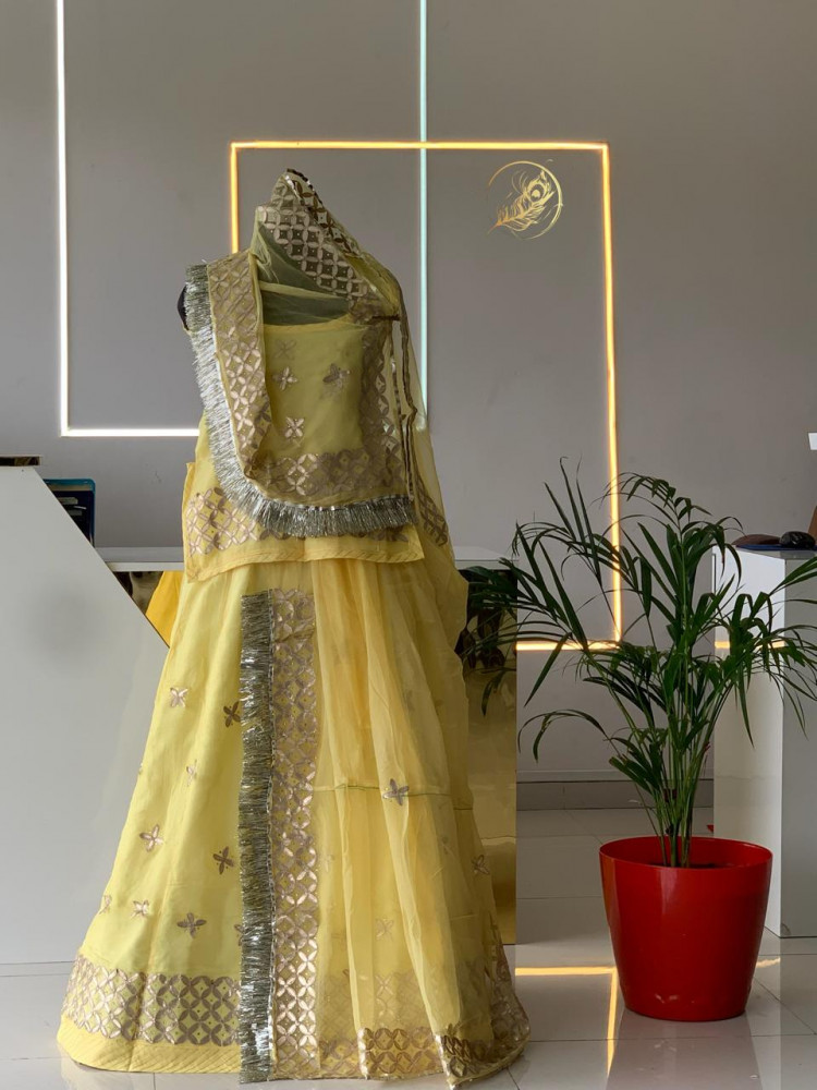 Fabric: Full thakurji georgette lemon colour hand dyed.